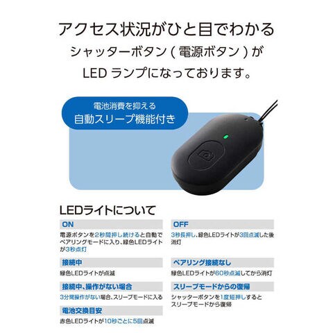 シャッターボタン(電源ボタン)がLEDランプになっていて、スマートフォンとのアクセス状況がひと目でわかります。