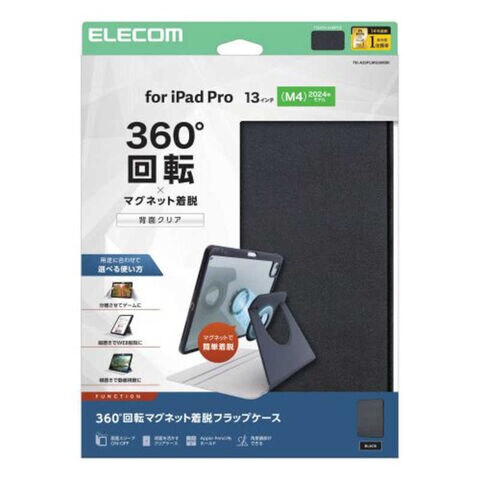 エレコム ELECOM iPad Pro ケース 13インチ ( M4 ) マグネット着脱フラップ カバー 360度回転 Apple Pencil収納 2段階角度調節 スタンド オートスリープ機能 背面クリア TB-A25PLMG360BK