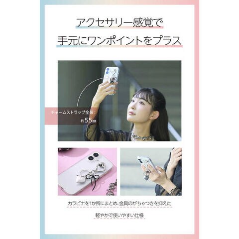 さりげないブラックリボンが落ち着いた大人の雰囲気を演出するチャームストラップです。