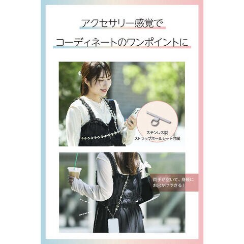 ケースにストラップホールがなくても、付属のストラップホールシートをスマートフォンとケースの間に挟むだけで使用でき、取り外しも簡単です。