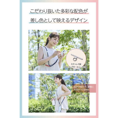 ケースにストラップホールがなくても、付属のストラップホールシートをスマートフォンとケースの間に挟むだけで使用でき、取り外しも簡単です。