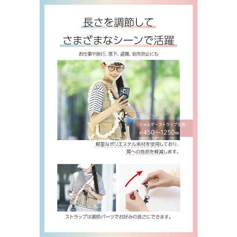 仕様1:■サイズ:ショルダーストラップ:全長約450mm~約1250mm、ストラップホールシート:W約45mm×D約0.2mm×H約23mm■耐荷重:約10kgまで ※250g以上の機器本体には使用しないでください。■セット内容:ショルダーストラップ、ストラップホールシート(1口)1枚■材質:ショルダーストラップ:ポリエステル・亜鉛合金・ポリアセタール、ストラップホールシート:ステンレス■カラー:アイボリー
