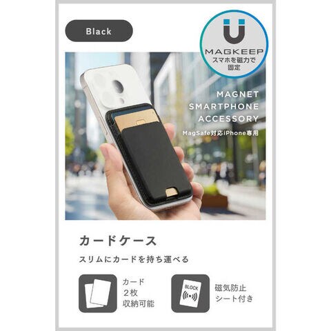 仕様1:■対応機種:MagSafe対応iPhone ※MagSafe非対応の機器本体やケースには使用できません。■セット内容:カードケース、磁気防止シート■材質:カードケース:ポリウレタン・ポリエステル・ポリカーボネート・鉄・磁石、磁気防止シート:PET・鉄■外形寸法:W約67mm×D約7mm×H約99mm■カラー:ブラック