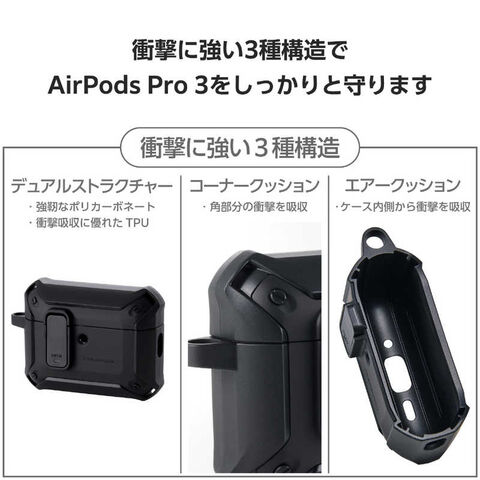 エレコム ELECOM AirPods Pro 3 ケース MagSafe対応 ZEROSHOCK 3構造衝撃吸収 ロック機能 カラビナ付 落下防止 マットブラック AVA-AP07ZEROLB2