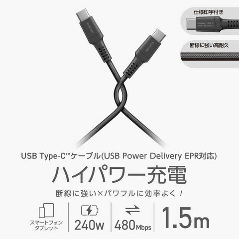 エレコム ELECOM 240W PD EPR USB Type-C ケーブル 1.5m 高耐久ナイロン 断線に強い eMarker 480Mbps ブラック MPA-CCPES15BK