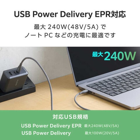 USB Power Delivery EPR対応により、最大240W(48V/5A)の電力で接続機器への充電が可能です。