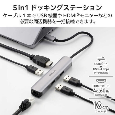 エレコム ELECOM ドッキングステーション 5-in-1 USB-C ハブ HDMI 4K/60Hz USB-A×3 LAN ケーブル一体18cm アルミ筐体 シルバー DST-052BPSV