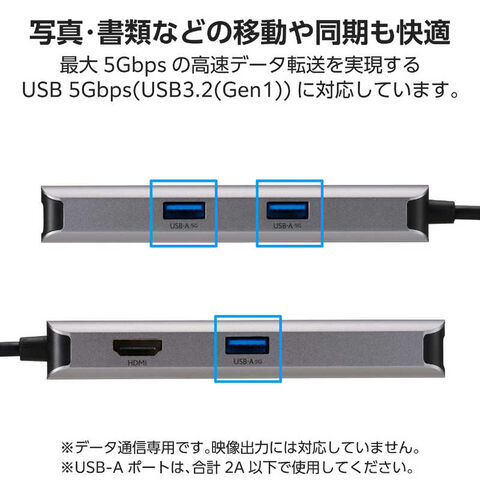 仕様2:<ダウンストリーム>[USBポート]USB-Aポート(USB 5Gbps、USB3.2 Gen1) x3 ※映像出力非対応 ※USB-Aポートは、合計2A以下で使用してください。 ※機器や接続するケーブルによっては、充電とデータ通信ができない可能性があります。[映像出力ポート]HDMI(対応解像度:最大4K/60Hz) x1[LANポート]RJ-45(1000BASE-T/100BASE-TX/10BASE-T) x1