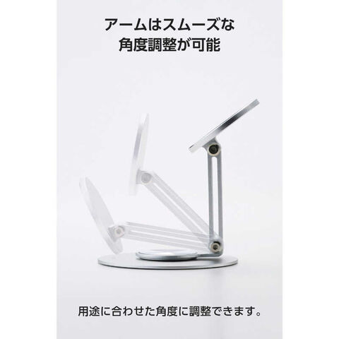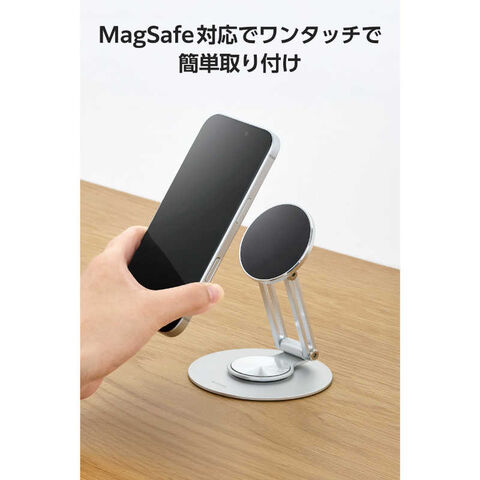 仕様1:■対応機種:MagSafe対応iPhone ※2025年12月現在。磁力装着できない機種は、付属のメタルプレートを貼り付けて使用可能です。 ※ケースの材質、厚みなどによって対応できない場合がありますのでご了承ください。■外形寸法:W約98mm×D約98mm×H約22mm(折り畳み時)■内容物:スタンド×1、メタルプレート×1■材質:スタンド:アルミニウム・PVC・シリコン、メタルプレート:鉄