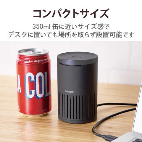 350ml缶ほどのサイズで円筒形デザインなので、デスクでも省スペースで設置可能です。