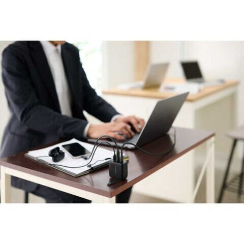 3ポートを同時に接続する場合、USBType-C(C1)ポート最大45W、USBType-C(C2)ポート最大7.5W、USB-Aポート最大7.5Wの合計最大出力60Wで、3台の機器を同時に充電できます。