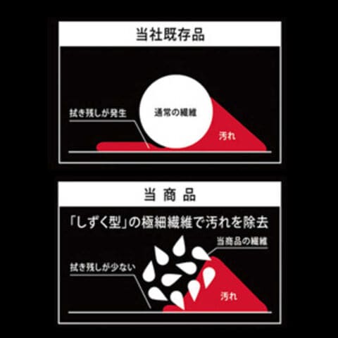 ・両面起毛加工された「しずく型」の極細繊維が、微細な凹凸をメガネを傷つけずふき取ります