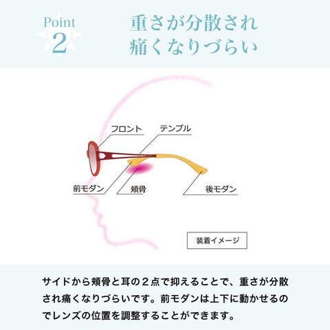 サイドから頬骨と耳の2点で抑えることで、重さが分散され痛くなりづらいです。