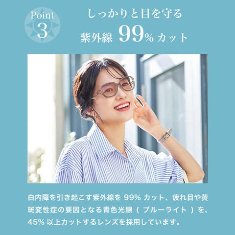 白内障を引き起こす紫外線を99%カット、疲れ目や黄斑変性症の要因となるブルーライトを45%以上カットするレンズを採用しています。