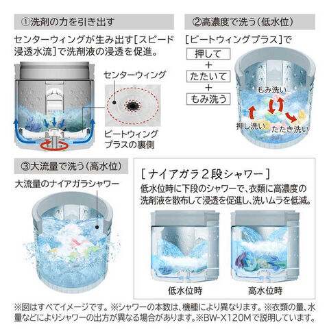 高濃度の洗剤液を衣類にすばやく浸透させ、[押し洗い][たたき洗い][もみ洗い]と大流量の[ナイアガラシャワー]で洗浄することで、しつこい汚れもすっきり洗い上げます。