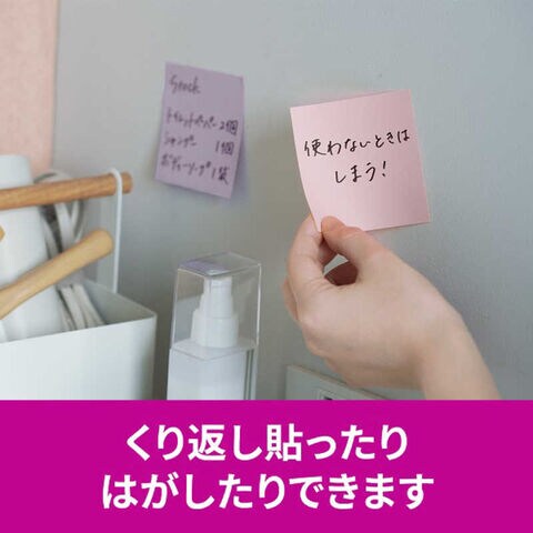●約2倍の粘着力(3M通常粘着比)で、パソコンや電話、キャビネットなどの樹脂面や垂直面など、つきにくかった場所にもしっかり貼れてはがれにくい製品です。
