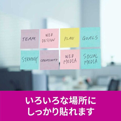●約2倍の粘着力(3M通常粘着比)で、パソコンや電話、キャビネットなどの樹脂面や垂直面など、つきにくかった場所にもしっかり貼れてはがれにくい製品です。