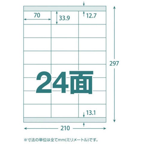 仕様1:[シートサイズ]A4(210x297mm)[ラベルサイズ]縦×横:33.9×70mm[厚さ]0.15mm(総厚)[色]白[面付]3列×8段(24面)[1パック内]2400片[材質]上質紙