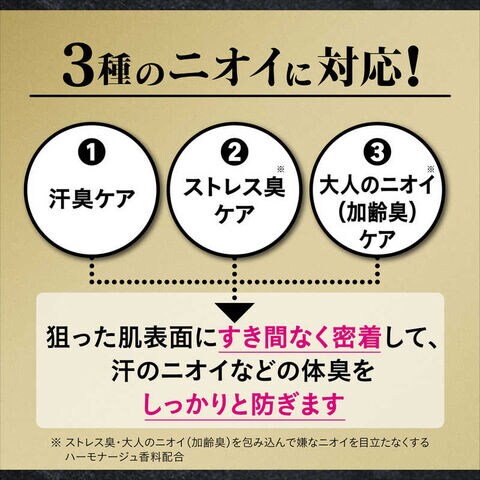 大人のニオイ(加齢臭)やストレス臭を包み込んで嫌なニオイを目立たなくするハーモナージュ香料配合。