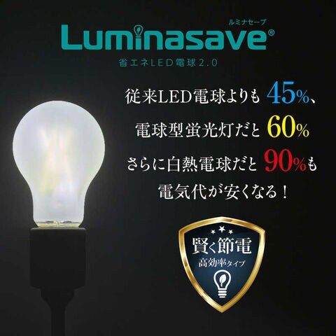 ルミナセーブ電球 40形相当 E26 昼白色 2.9W 消費効率195Lm/W 密閉器具対応 1時間あたりの電気代約0.09円 ※1◆節電・省エネ性能 第1位 ※2 ◆2027年 省エネ達成率:177.3%◆超省エネ電球 「ルミナセーブ」は、従来型のLED電球よりも約45%、電球型蛍光灯よりも約60%、白熱電球よりも約90% も電気代が安くなります!※3 しかも「超高効率フィラメントLED」を採用しているため白熱電球と同じ「320°の全配光角度」を実現! 明るくて環境にもお財布にも優しい「超省エネ電球」です。