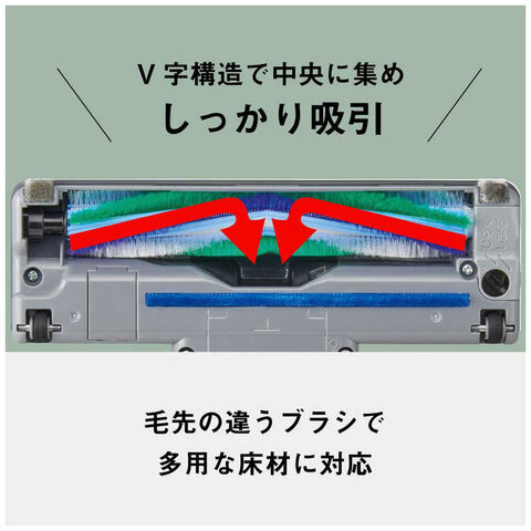 ◆V字構造でゴミを中央に集めてしっかり吸引!毛先の違うブラシで多様な床材に対応
