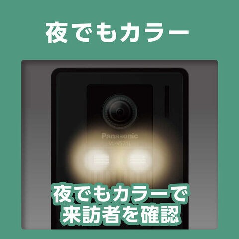 ●夜でもカラーで来客確認できる「LEDライト付き玄関子機」採用玄関子機に電球色のLEDライト(照明用ランプ)を搭載。周囲の明るさによって自動的にライトが点灯し、来訪者を照らします。電球色なので来訪者にとってもまぶしすぎず、夜間でも約50cm先までカラーで映ります。また、モニター親機の操作で点灯/消灯の切り替えも可能です。