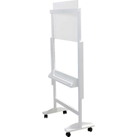 高さのあるスタンドタイプに移動用のキャスターとちょっとした小物置きを組合わせた機能性飛沫ガードパネル。