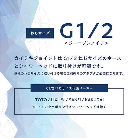 カイテキジョイントはG1/2ねじサイズのホースとシャワーヘッドに取付が可能。