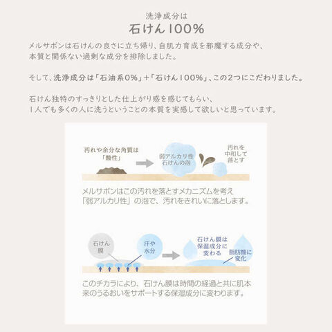 ボディソープの利便性と石けんの良さを合体させたメルサボンが、肌をしっとり、なめらかに洗い上げます。