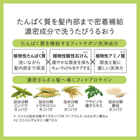 髪の毛の約80%が「たんぱく質」という事実に着目し、3種類のトリプル処方「フィトサボン洗浄成分」(植物性たんぱく質洗浄成分×植物性酸性石けん洗浄成分×アミノ酸洗浄成分)で優しく洗いながら保湿。