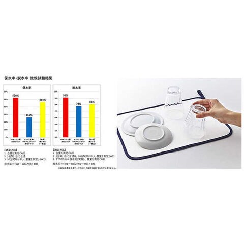 極細繊維「ベリーマ」を独特の編立で厚みを持たせたので、水分を素早く吸収し、洗い終わった食器の水切り・乾燥を早める。