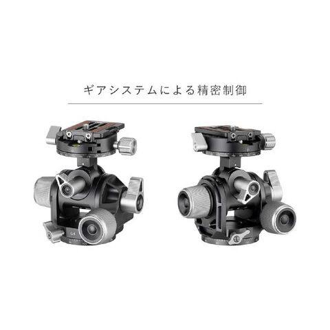 2箇所のダイヤルによる前後左右チルトの精密調整が可能なギア雲台。(※300mm以下のレンズでの使用を推奨。)
