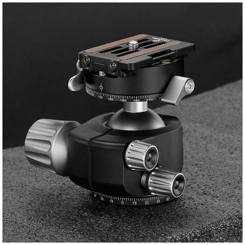 レバータイプのプレートリリース機構を搭載したコンパクトな低重心型ボール雲台。