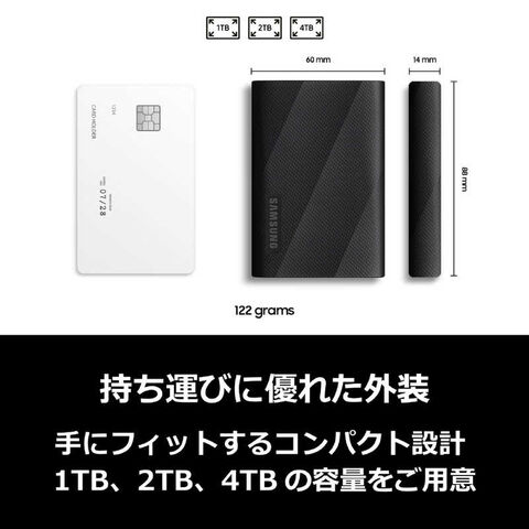 1TB、2TB、4TB の容量ラインアップのT9は、コンパクトな形状で重量は122gです。滑りにくいドット処理と快適なグリップ感で手の平にしっかりと収まります。