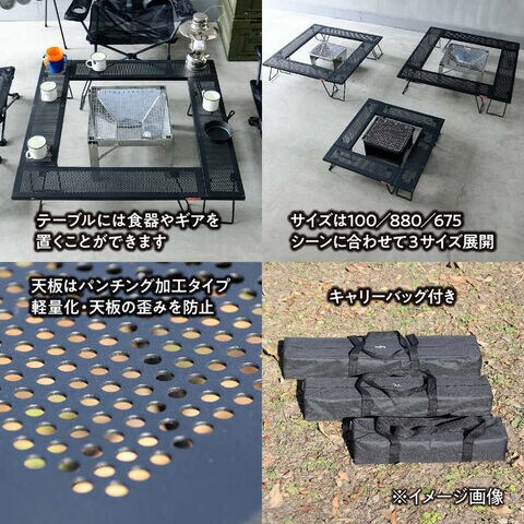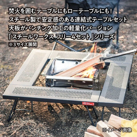 仕様2:特徴:焚火を囲むテーブルにもローテーブルにも!スチール製で安定感のある連結式テーブルセット。天板がパンチング加工の軽量化バージョン「スチールワークスフリー4セット」シリーズ。サイズ:67.5×67.5×17.5(h)cm、内寸/40.5×40.5cm、単体/54×13.5×17.5cm、収納サイズ/55.5×17.5×11(h)cm付属品:キャリーバッグ安全耐荷重:テーブル1台につき20kg