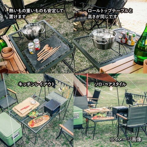耐熱性に優れたスチール製、重厚感がある作りで地面にしっかりと置け、安定感のあるテーブル。