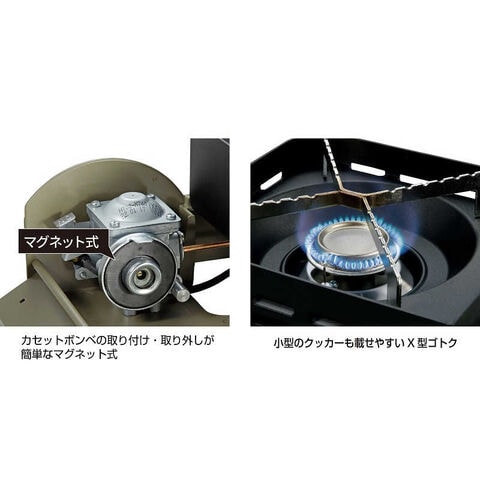 ・カセットボンベの取り付け・取り外しが簡単なマグネット式・小型クッカーも載せやすいX型ゴトク・持ち運び収納に便利な専用ケース付き。