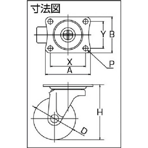 許容荷重(kgf):20.4、車輪径D(mm):38、車輪幅(mm):17、取付高H(mm):50、取付座A×B(mm):46×38、取付ピッチX×Y(mm):36×28、取付穴径P(mm):5.3、許容荷重(N):200、質量(g):80、許容荷重(daN):20