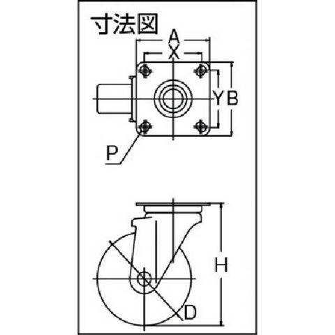許容荷重(kgf):183.6、車輪幅(mm):40、許容荷重(N):1800、車輪径 D(mm):150、取付高 H(mm):190、取付座 A×B(mm):102×102、取付ピッチ X×Y(mm):75~80×75~80、取付穴径 P(mm):11、質量(kg):1.51、許容荷重(daN):180