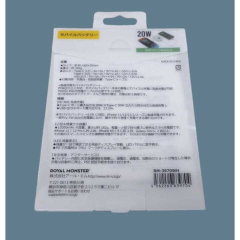 ROYALMONSTER モバイルバッテリーコンパクト 10000mAh WH [USB Power Delivery・Quick Charge対応 /1ポート /充電タイプ] RM-3970WH