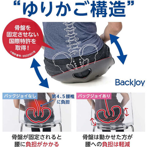 BackJoy(バックジョイ)は骨盤を立て、背骨を自然なS字曲線へ導くことにより腰への負担を軽減します。