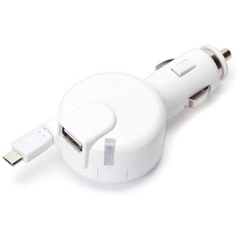 車からスマホ・タブレットが充電可能な micro USBコネクタ 巻き取り式車載用DC充電器。「microUSBコネクタケーブル 0.6m & USB1ポート搭載 車載用DC充電器 合計出力 2.4A」[12V/24V車]