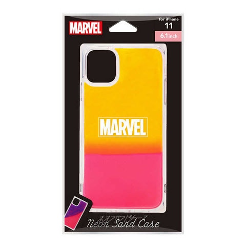 MARVELロゴデザインの暗闇の中でほんのり光る蓄光タイプのiPhone 11用ネオンサンドケースです。