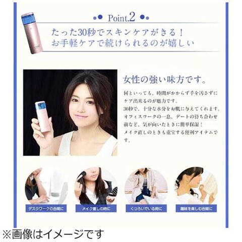 ナノ粒子が肌を包み込んで保湿!メイクの上からでもOK 美ルルモイスミストはメイクの上からでもOK。超微粒子ミストがファンデーションの粒子の間を通り抜けて肌に潤いを与えます。