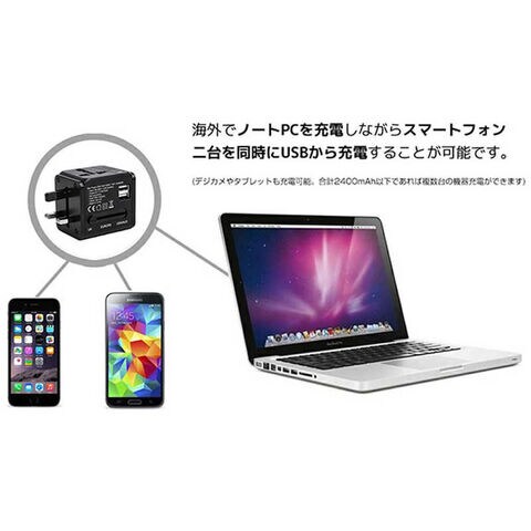 海外でノートPCを充電しながらスマートフォン二台を同時にUSBから充電する事が可能です。
