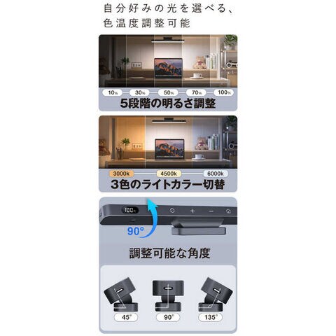 ・色温度の調整:3000K(ウォームホワイト)、4500K(ナチュラルホワイト)、6000K(クールホワイト)