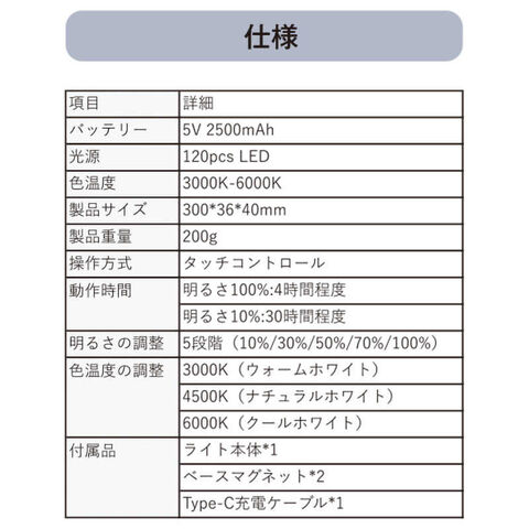 ・付属品:ライト本体×1、ベースマグネット×2、Type-C充電ケーブル×1