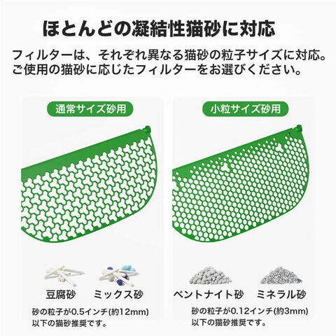 猫砂フィルターはベントナイト砂・ミネラル砂に対応しています。
