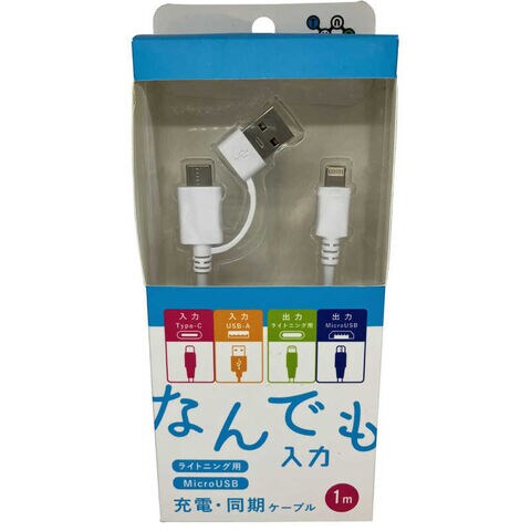2in1マルチコネクタしなやかケーブル、マルチコネクタ(Micro-B/Lightning:5V/2.4A)出力、マルチ入力(USB-A/Type-C:5V/2.4A)、1m、白特許製品