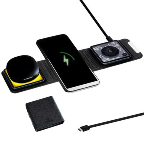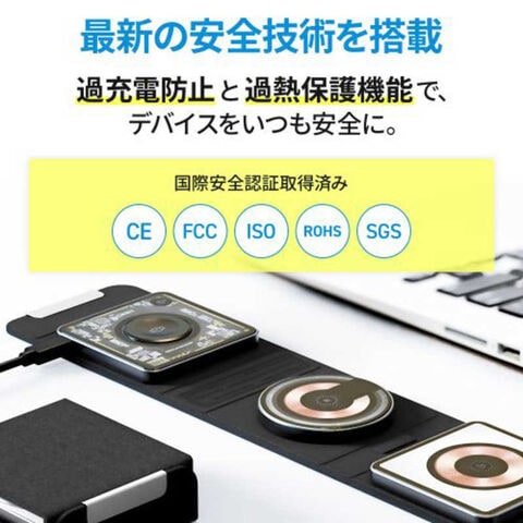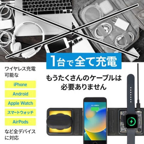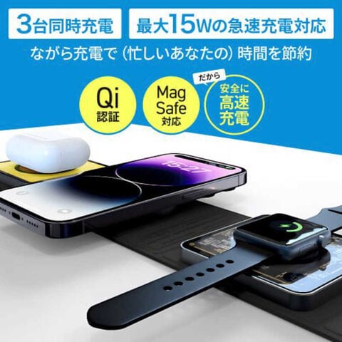 このマルチデバイス充電器は、スマートフォン、イヤホン、スマートウォッチの3台を同時に充電可能です。